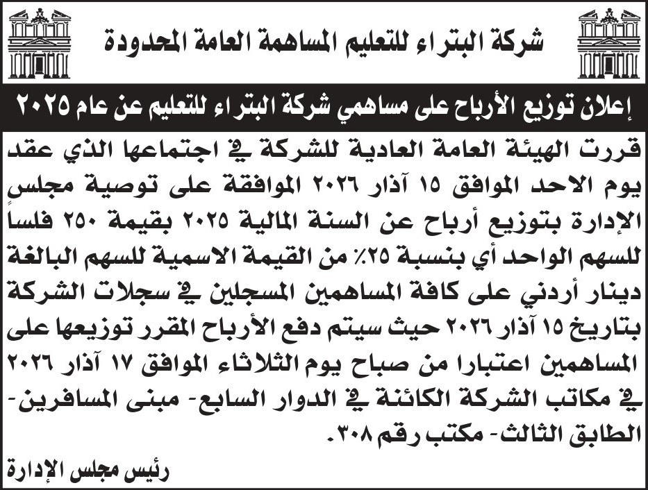 إعلان توزيع الأرباح على مساهمي شركة البتراء للتعليم عن عام 2025